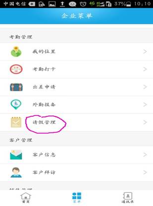 µÚ¶þ²½£ºµã»÷²Ëµ¥£¬Ñ¡ÔñÇë¼ÙÖÎÀí